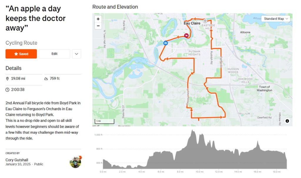 2nd Annual Fall bicycle ride from Boyd Park in Eau Claire to Ferguson’s Orchards in Eau Claire returning to Boyd Park.