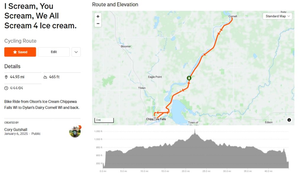 Bike Ride from Olson’s Ice Cream Chippewa Falls WI to Dylan’s Dairy Cornell WI and back.